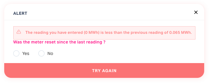 If a value is found to drastically violate the rules set then, the continue option will not appear. This ensures that irregularities in consumption are noticed and when erroneous readings are encountered, the system takes notice and stops until the right value is entered.