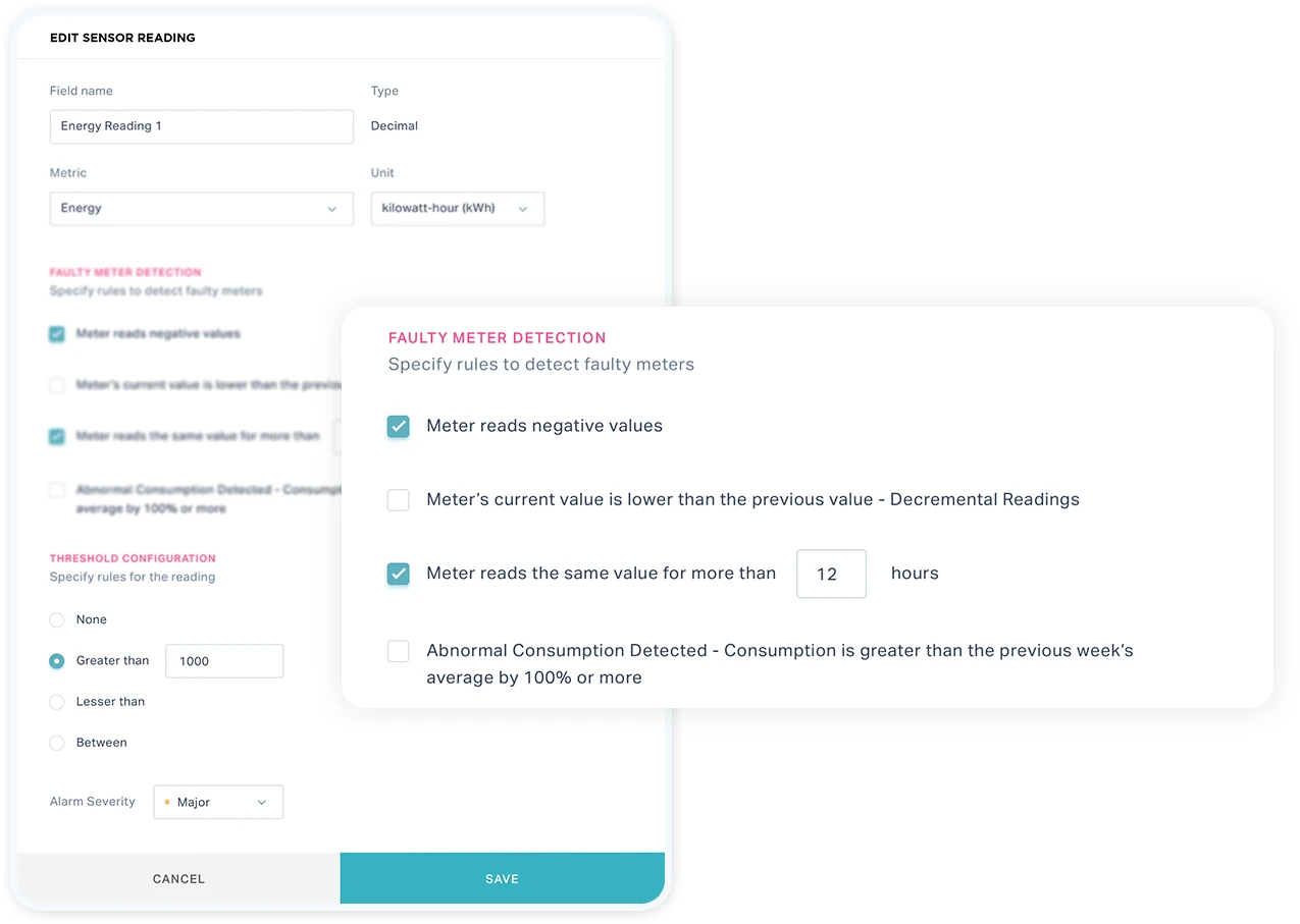 Facilio’s robust rule engine lets you define fault conditions for any type of sensor or device. You can set max/min limits, operator/function validations for counting sensors, flag data fluctuations, and more. Get alerts on rule violations or when the meter reads the same value for an extended period of time.